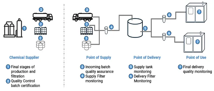 There are multiple sources of particle precursors in chemical delivery systems including ion exchange resins, tubing and piping, fluid handling components and filter membranes.