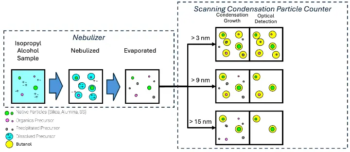 The sample is nebulized into a fine mist of droplets (100’s of nm in diameter) with a patented nano-nebulizer. Larger droplets, likelier to contain multiple particles, are removed by inertial impaction. The IPA is then evaporated so that only the particles and non-volatile precursors remain.