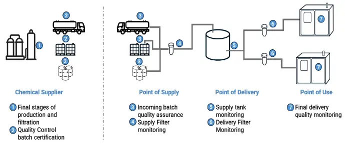 There are multiple potential sources of particle precursors in chemical delivery systems including ion exchange resins, tubing and piping, fluid handling components and filter membranes.