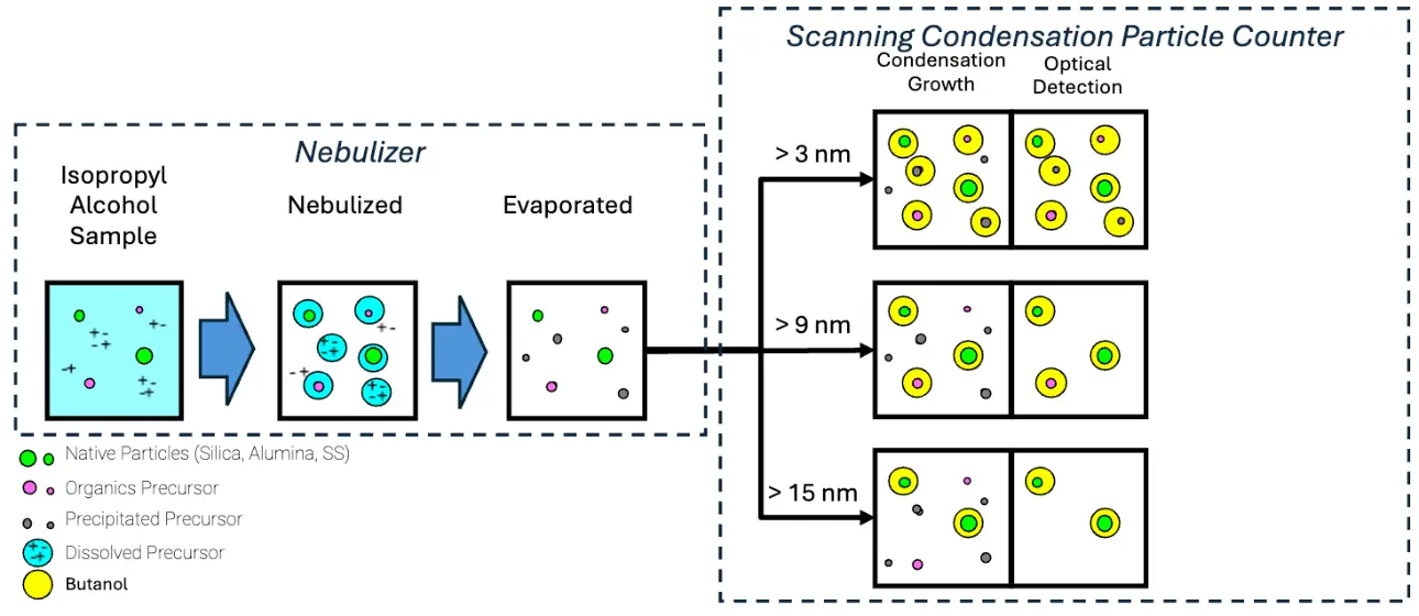 Conventional light-scattering particle detection technologies are challenged to measure particles below 20nm, much less particle precursors, which do not form particles until wafer drying.
